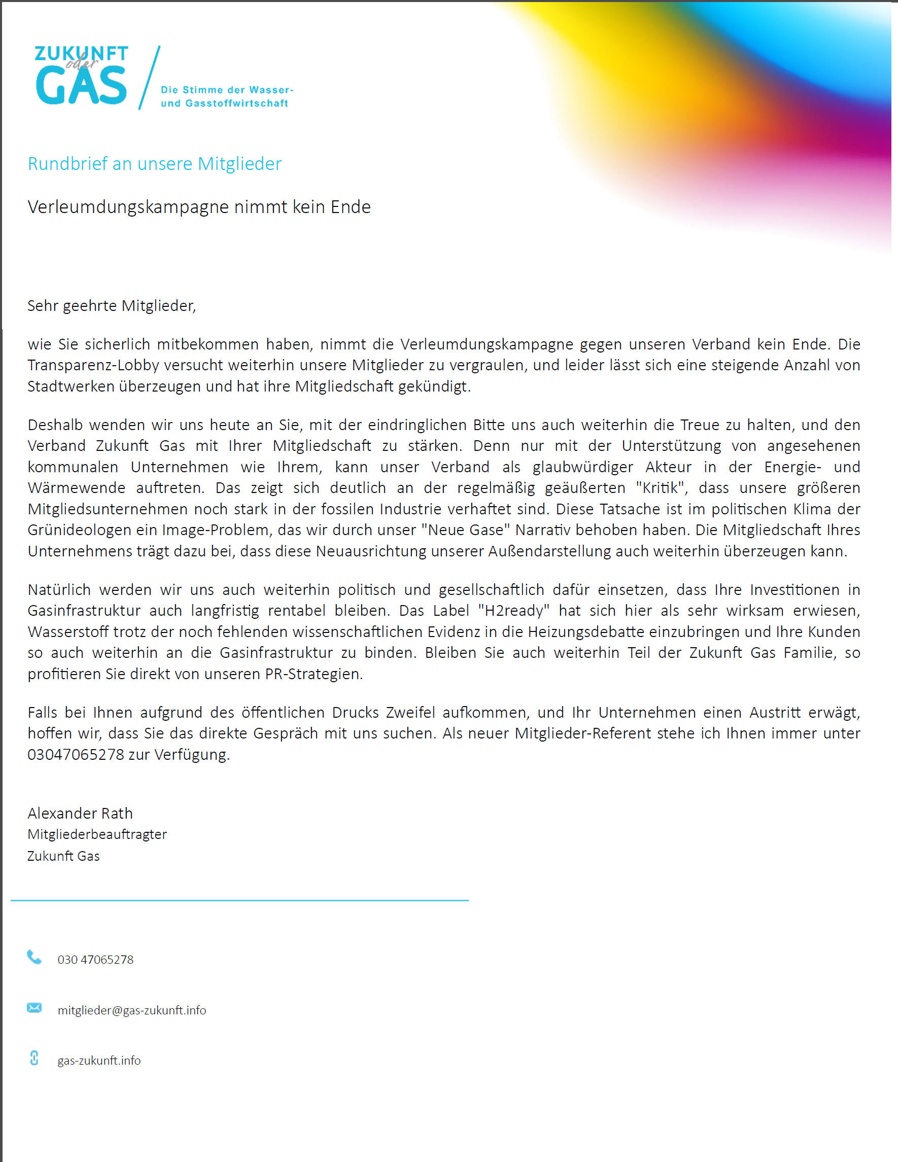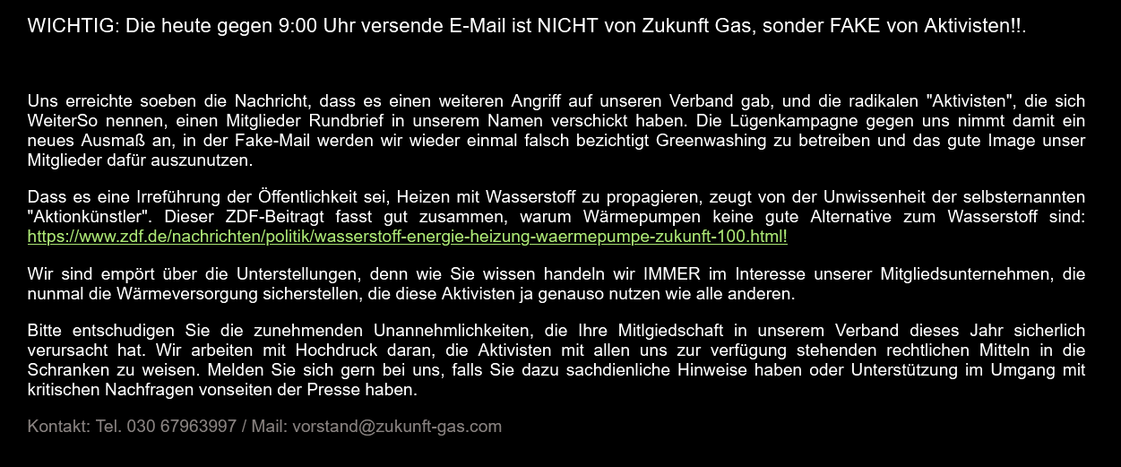 Uns ist dann auch aufgefallen, dass dieses Statement unmöglich von Zukunft Gas stammen kann, dafür war es einfach zu ehrlich. Bisher habt ihr ja immer dementiert, dass ihr das gute Image der Stadtwerke für die Agenda der großen Gaskonzerne ausnutzt. Uns ist schnell klar geworden, dass dieses ungewohnt ehrliche Statement einen kontraproduktiven Effekt haben, und weitere Stadtwerke zum Austritt bewegen kann. Auch die darin verlinkte Website gas-zukunft.info lässt euch nicht gerade in einem guten Licht dastehen, und ist auch deutlich humorvoller, als wir es euch zutrauen. Deshalb haben wir schnell eine Richtigstellung verfasst und verschickt: