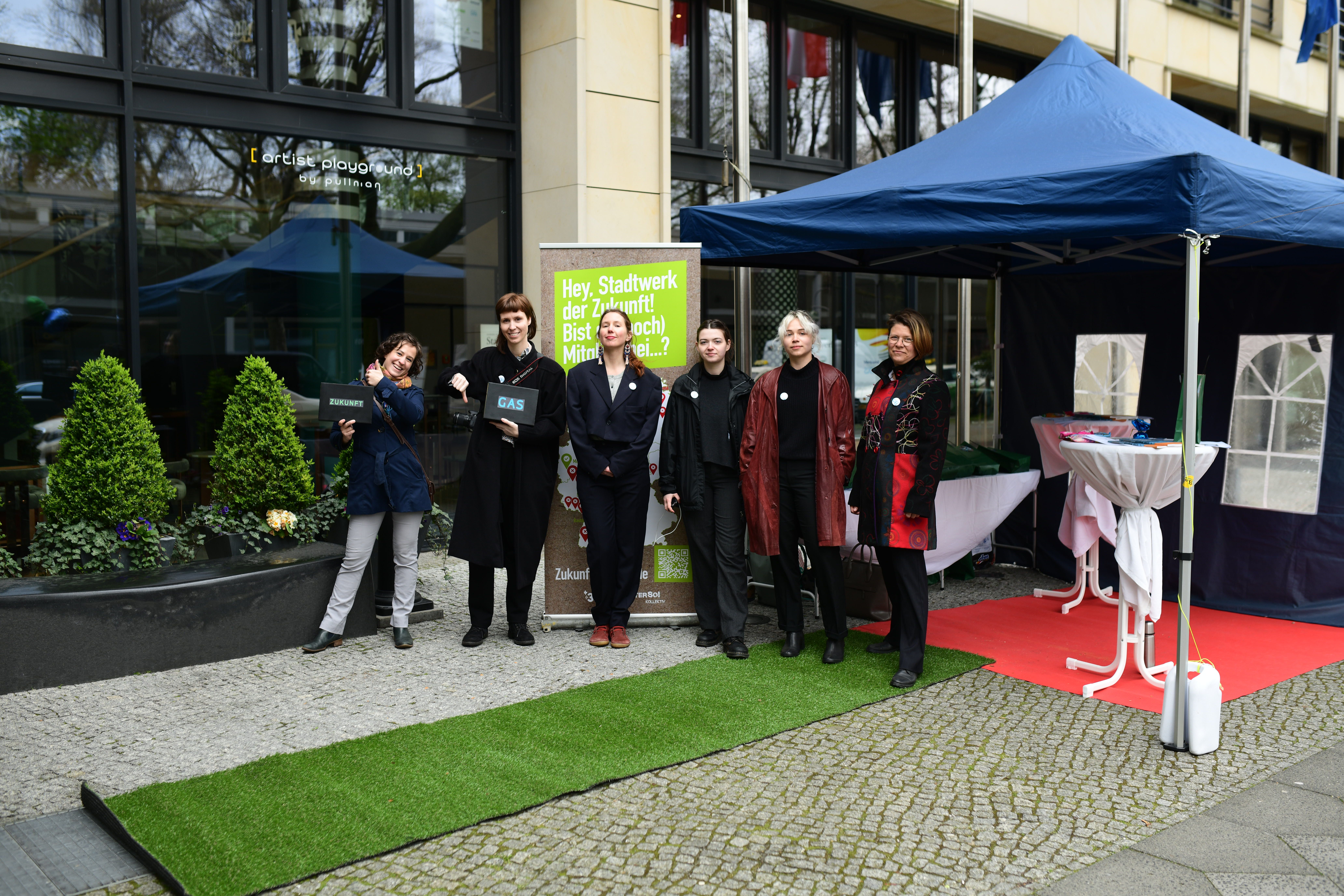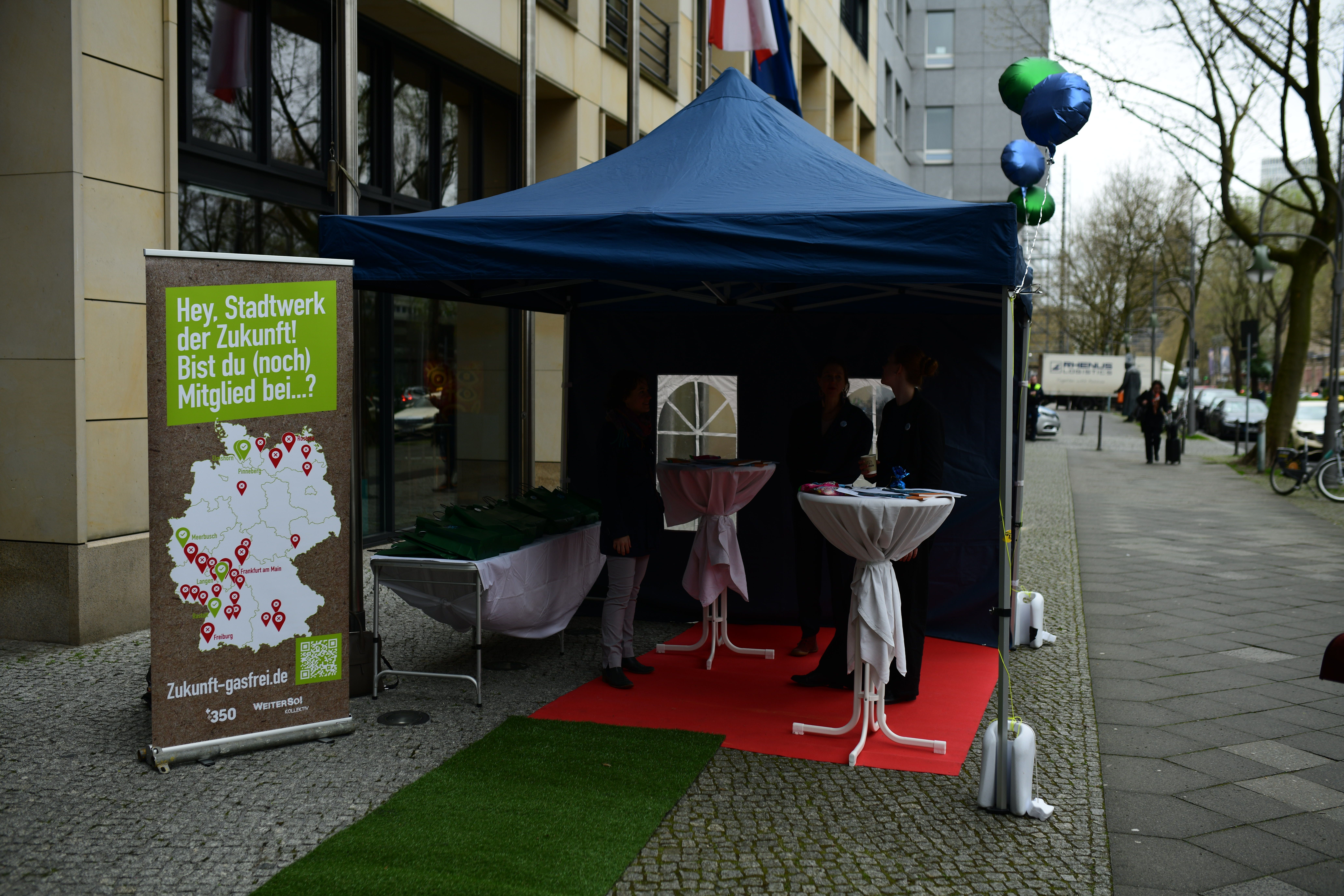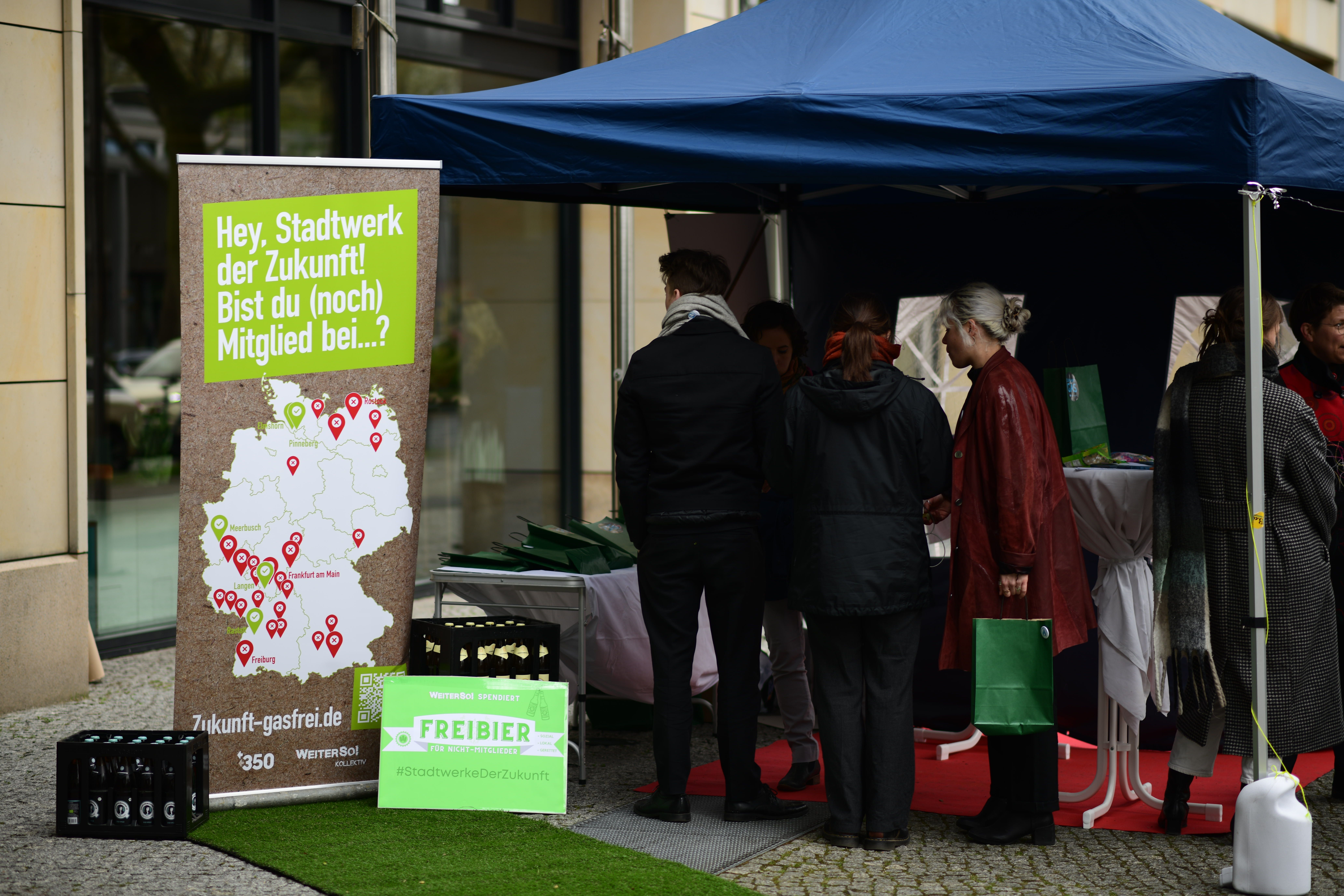 Am 25.04. haben wir anlässlich des Stadtwerke-Kongresses im Hotel Pullmann Berlin Schweizerhof zusammen mit der internationalen Klimaschutzorganisation 350.org eine Kunstaktion gemacht. Dort verteilten wir Geschenktüten an die Kongressteilnehmenden. Darin: Infomaterial zur Gaslobby, Sticker und Buttons mit dem Aufdruck "Zukunft Gas - Nein Danke" und Austrittsanträge, mit denen die Mitgliedschaft bei Zukunft Gas auf der Stelle gekündigt werden kann. Für alle Stadtwerke, die nicht Mitglied bei Zukunft Gas oder bereits ausgetreten sind, gab es Freibier.